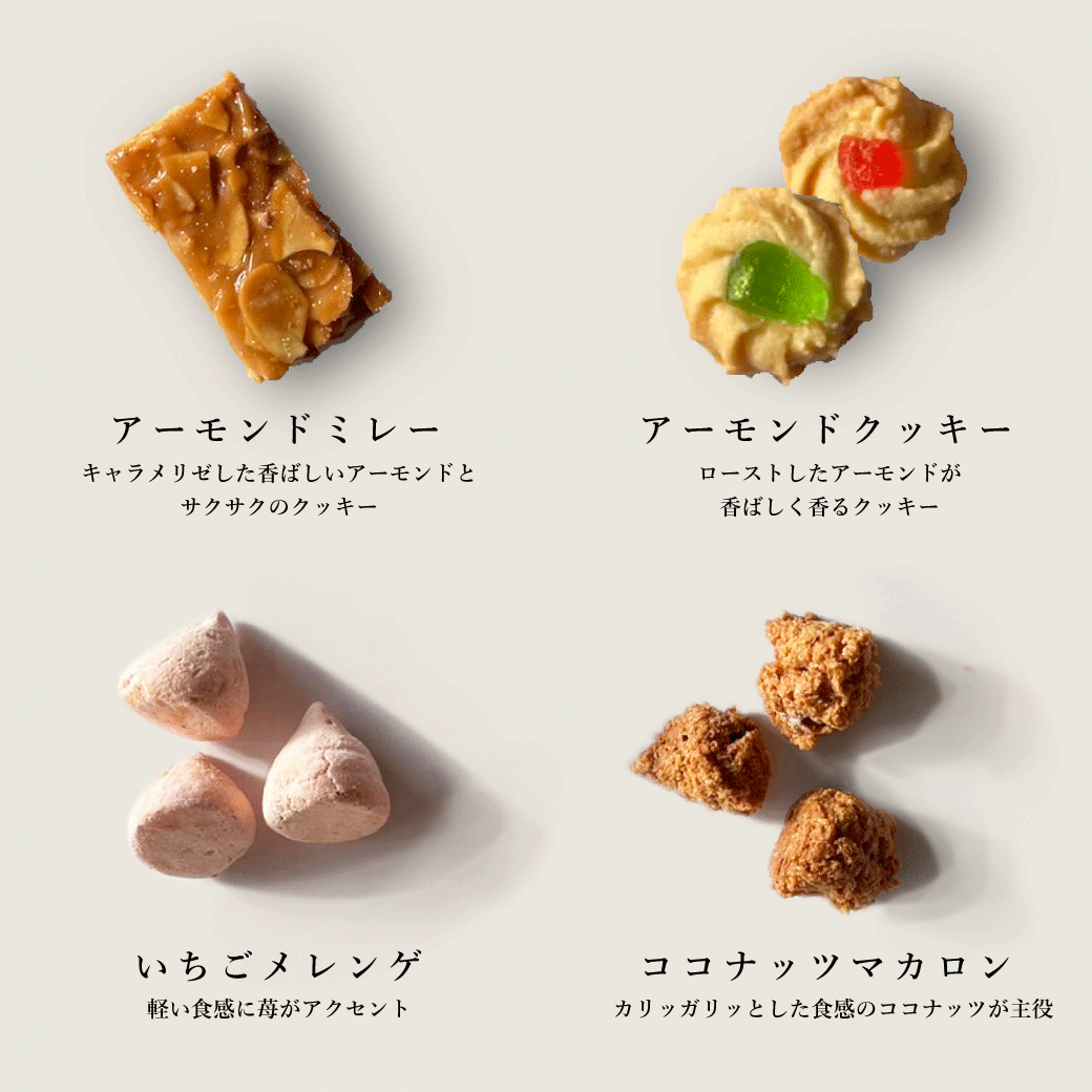 (クッキーの種類:ホワイトチョコクッキー・ねこクッキー・アーモンドクッキー・アーモンドミレー・いちごメレンゲ・ココナッツマカロン・バタークッキー・チェリーウエハ)