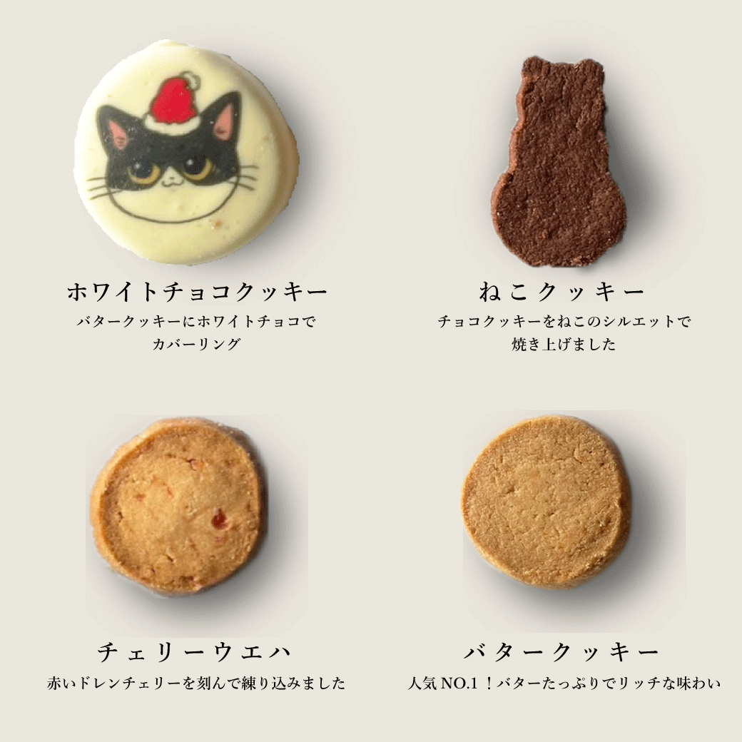 猫のシルエットクッキーや猫のプリントクッキーが入り、猫好きの心をくすぐります。