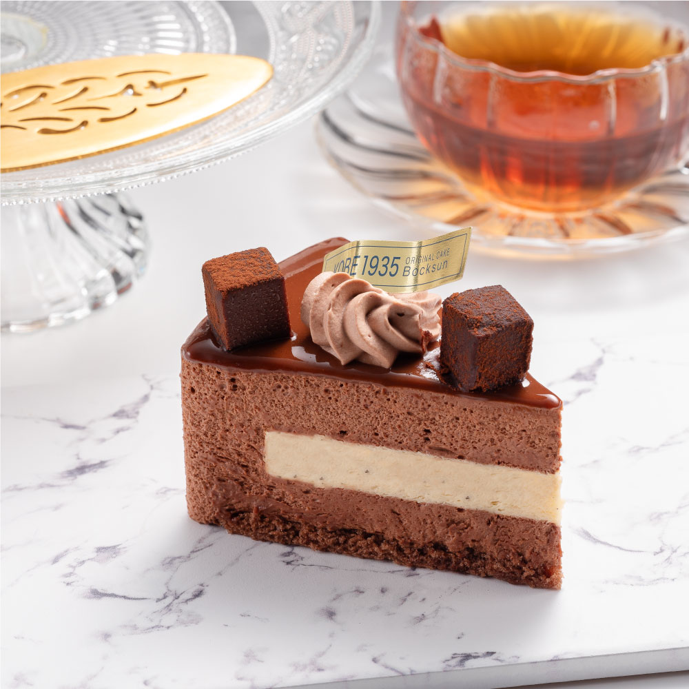 濃厚なチョコムースに、バニラムースを重ねたバランスの良いケーキに、口どけ滑らかなチョコレートをトッピング。