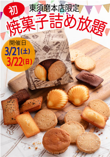2026年3月22日(土)、23日(日)東須磨本店にて「焼き菓子詰め放題」を初開催いたします! クッキー5種やフィナンシェなどボックサンで人気の焼き菓子が勢ぞろい☆お得にゲットしちゃいましょう! 詳細は下記チラシをクリックしてご覧ください。